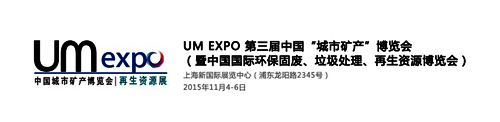 作为产业最为优秀的技术交流、设备展示平台,“UM EXPO 第三届中国“城市矿产”博览会(暨中国国际固废、垃圾处理、再生资源博览会)”将于2015年11月4 -6日在上海新国际博览中心举行。